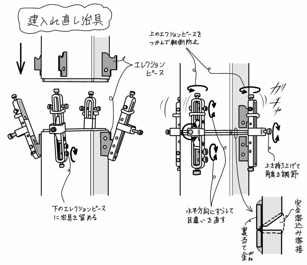 エレクションピースをスプライスプレートではさんで高力ボルトで締めるのが従来のやり方ですが、目違いや垂直の調整に手間がかかりました。建入れ直し治具は、上の柱を固定すると同時にボルトで位置や角度を調整できるようにした製品です。下の柱に開いた状態で治具を付けておき、上の柱を下ろしてから転倒防止ボルトを締め、次に目違いや垂直をボルトを回すことで直します。柱を立て、梁を架けて最終調整後に完全溶込み溶接を行います。治具とは英語のjigの当て字で、加工、組立ての際に固定して位置決めするための器具のことです。